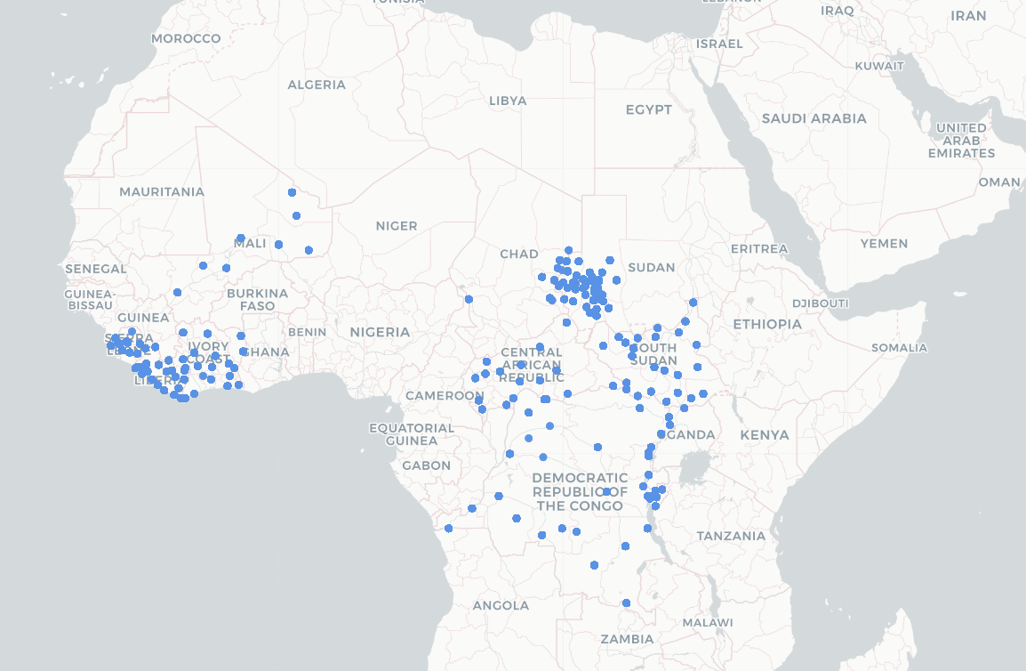 GeoCivPKO is a temporally and spatially disaggregated dataset on the deployment of civilian personnel across field locations (see blue dots below) for 12 United Nations Peacekeeping Operations in ten Sub-Saharan African countries in the period 2000-2021.