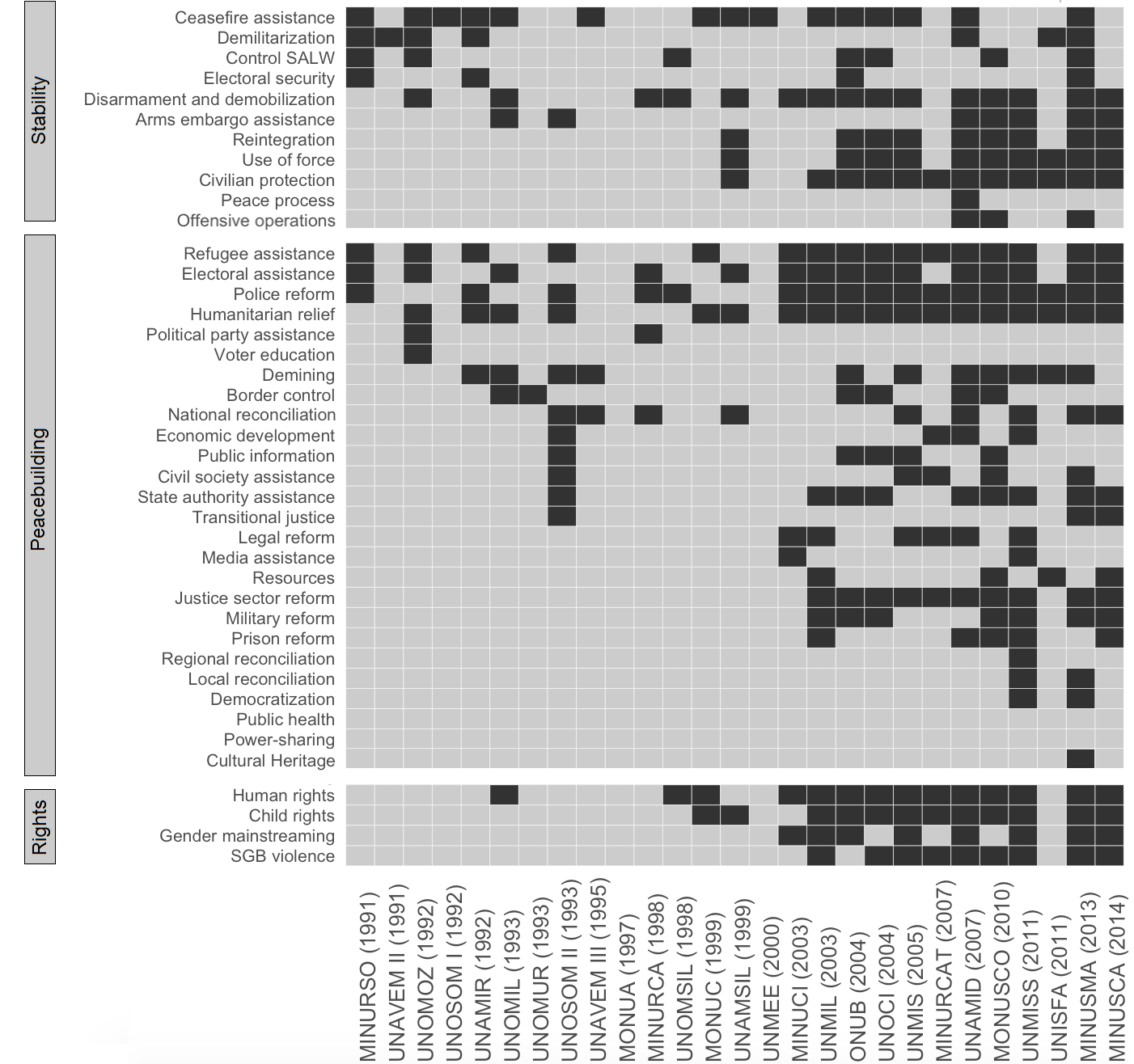PEMA draws on UN Security Council resolutions that establish, extend, or revise mandates of UN peacekeeping operations. The dataset records 41 distinct tasks, ranging from disarmament to reconciliation and electoral support. For each task, the PEMA dataset also distinguishes between three modalities of engagement (monitoring, assisting, and securing) and whether the task is requested or merely encouraged. The newest version of PEMA (Version 2) does not only include all UN peacekeeping operations in Africa in the 1991–2017 period, but also all UN peacekeeping missions in other world regions that have a start date in this period (e.g., including MINUSTAH but excluding UNFICYP). We are continuously updating the data to more recent years.